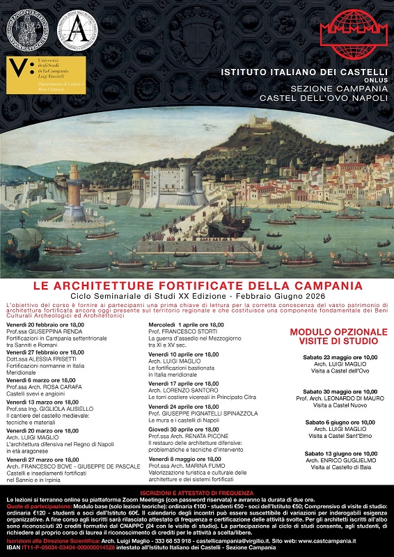 Gli interessati al corso possono rivolgersi alla Segreteria Scientifica contattando l'Arch. Luigi Maglio ai seguenti recapiti: cell.: 3336853918 e-mail: castellicampania@virgilio.it. La quota di partecipazione può essere versata tramite bonifico bancario: IBAN IT11P0503403404000000014528; intestato all’Istituto Italiano dei Castelli – Sezione Campania.